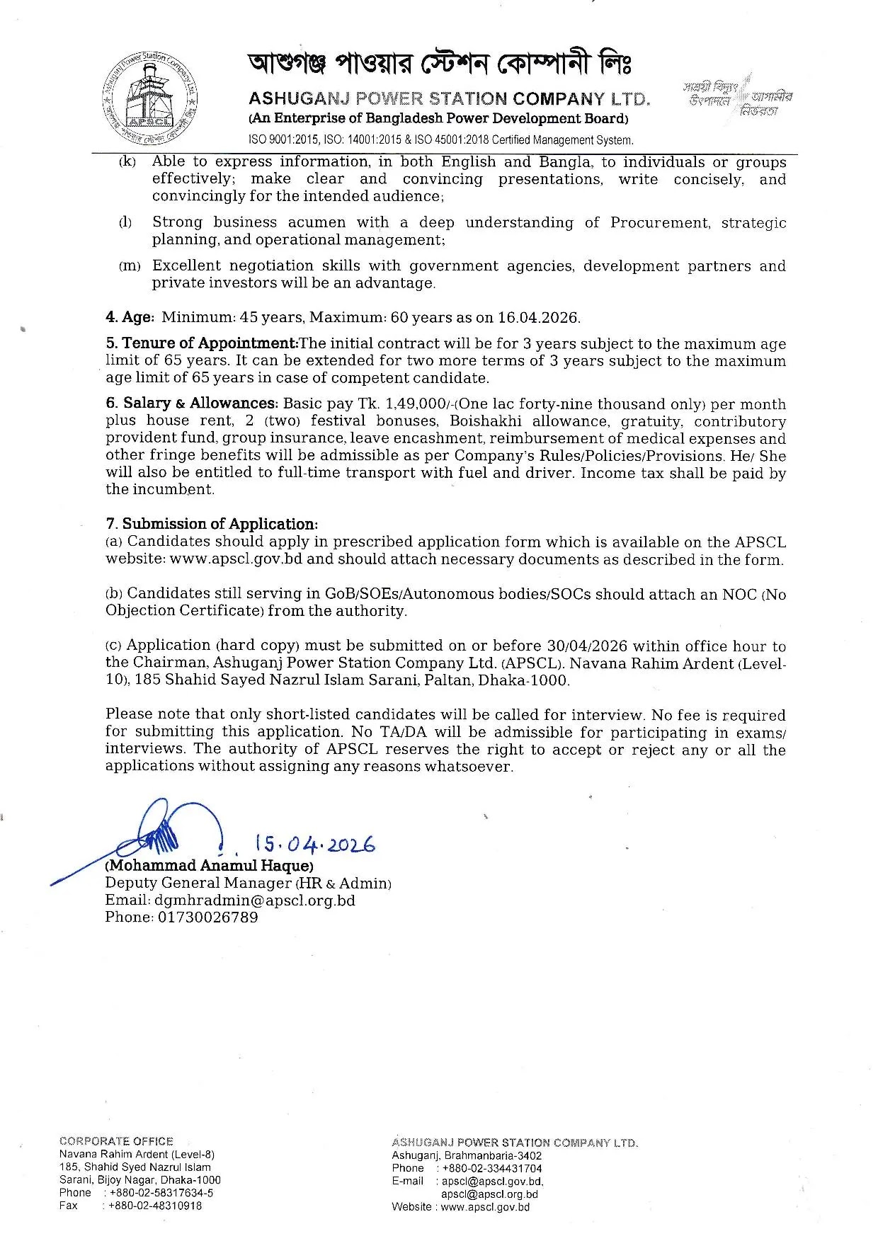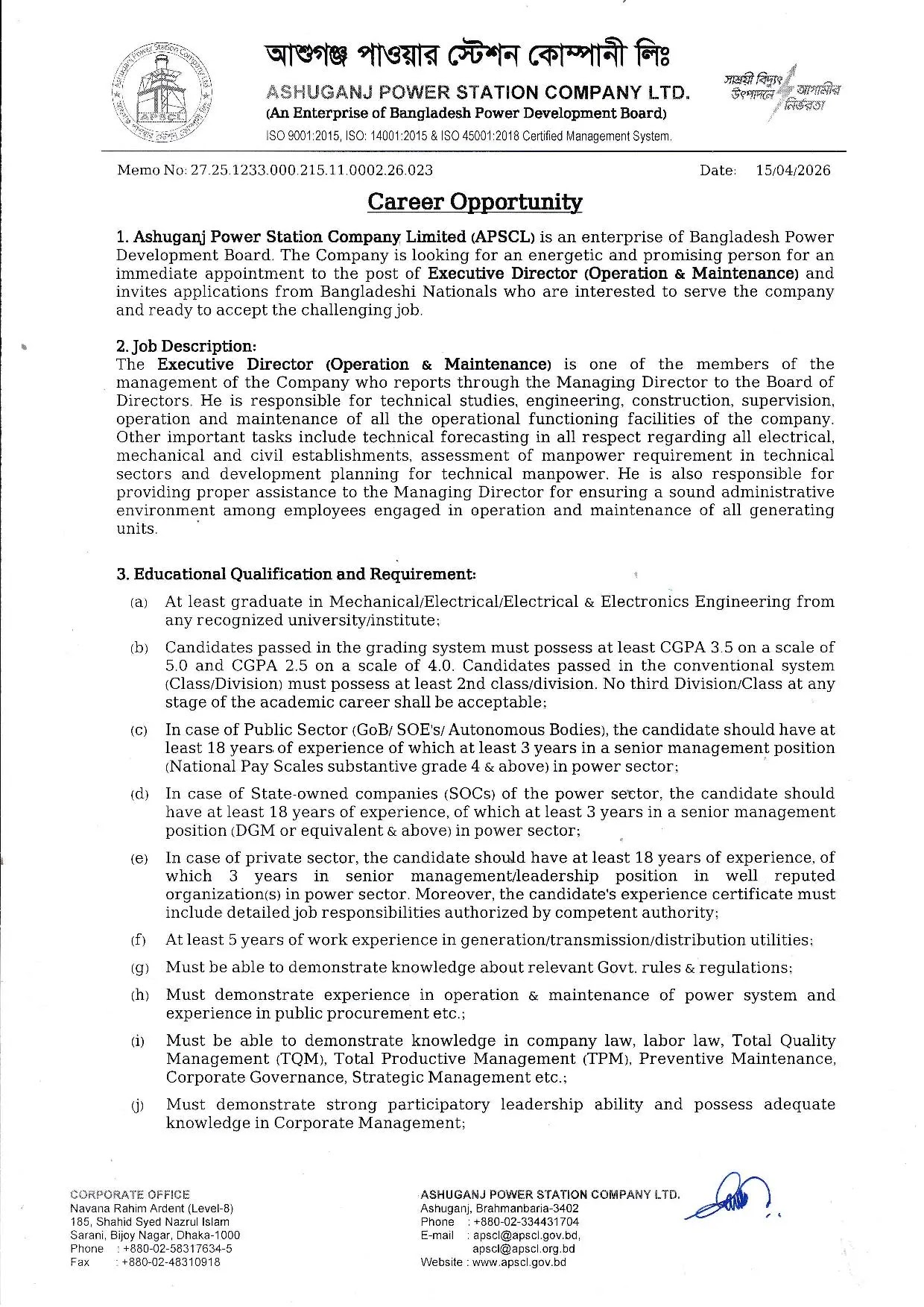 আশুগঞ্জ পাওয়ার স্টেশন কোম্পানী লিমিটেড নিয়োগ বিজ্ঞপ্তিটি