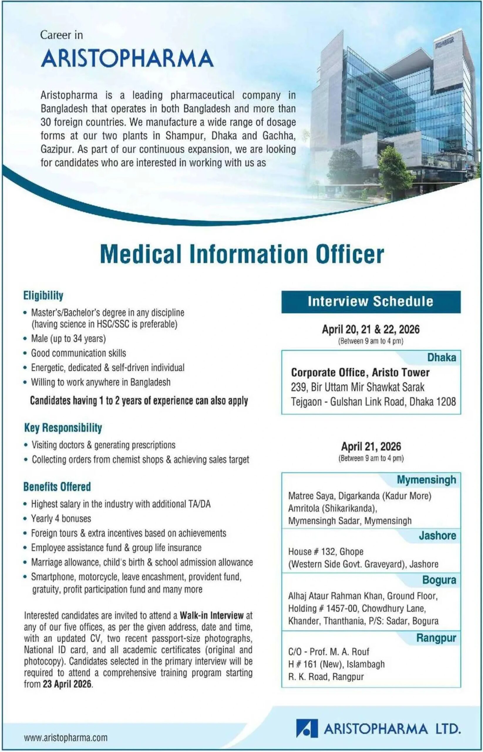 অ্যারিস্টো ফার্মা লিমিটেড চাকরির বিজ্ঞপ্তি ২০২৬