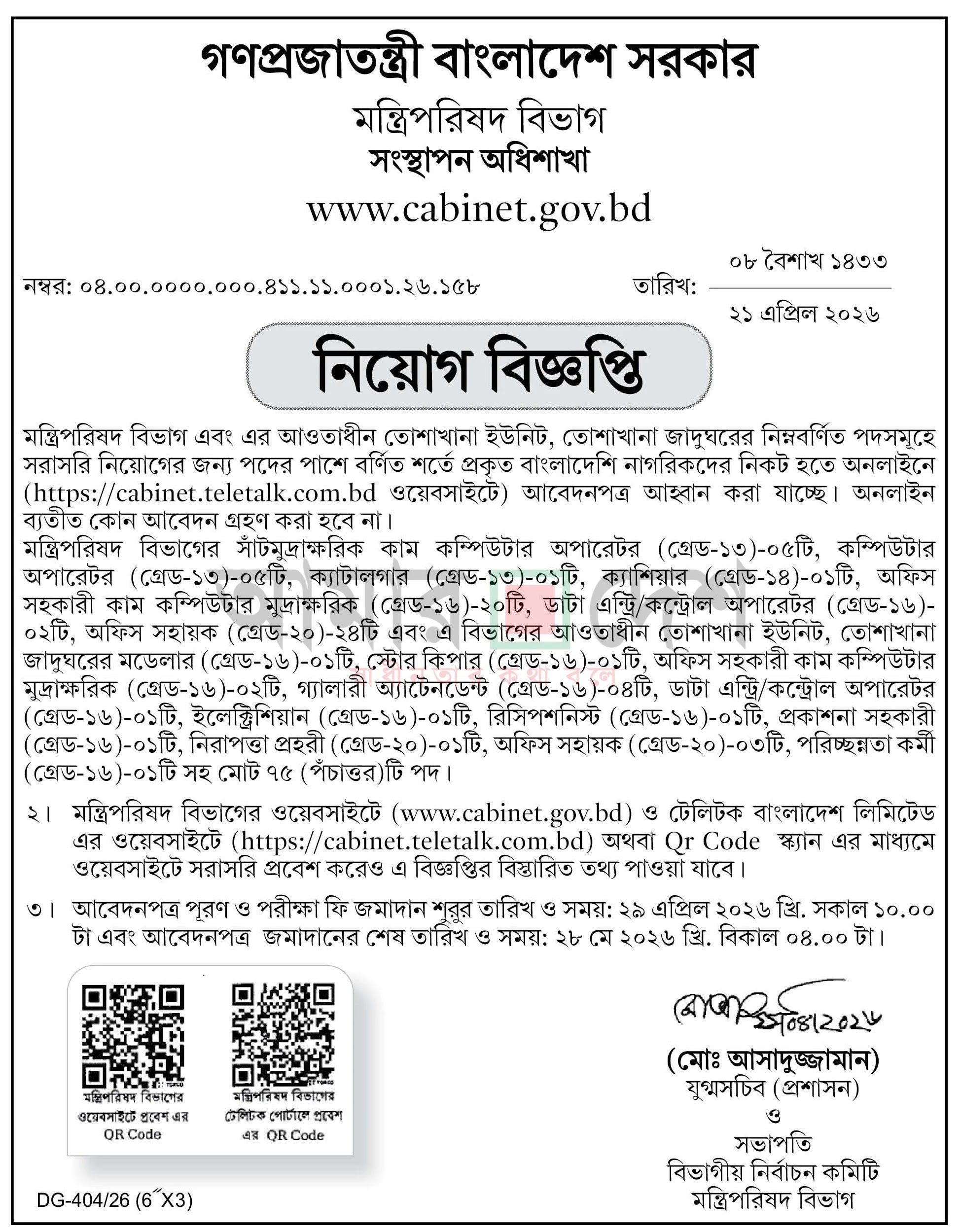 মন্ত্রিপরিষদ বিভাগ চাকরির বিজ্ঞপ্তি ২০২৬
