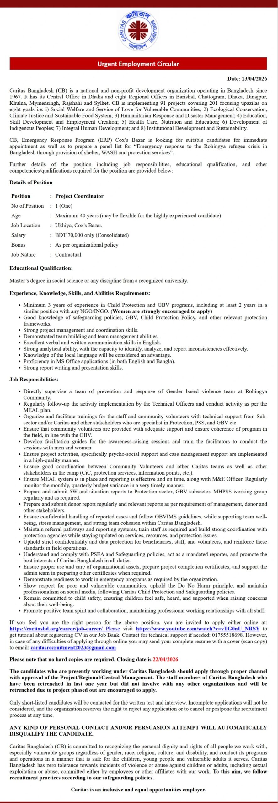 Caritas Bangladesh NGO Job Circular 2026