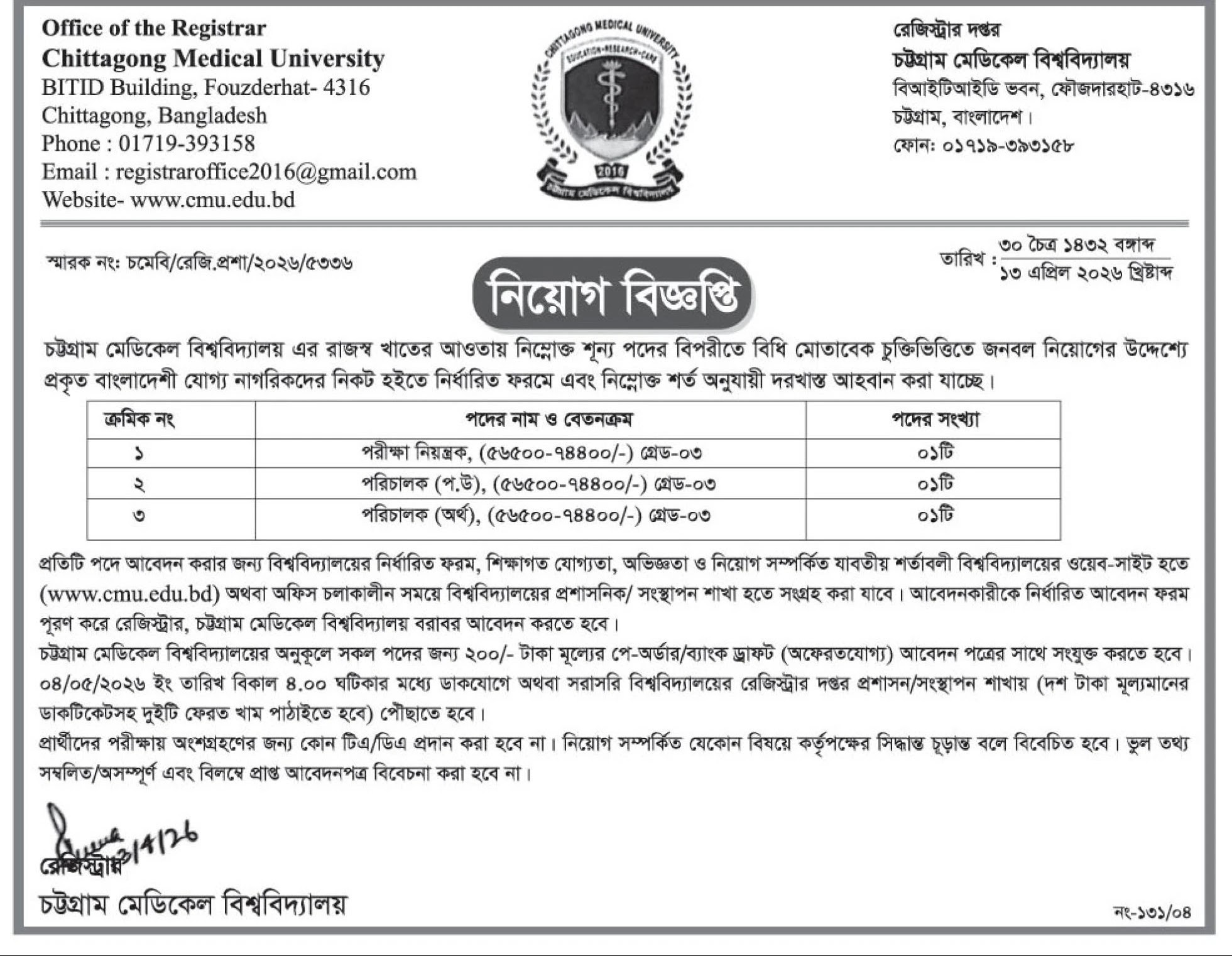 চট্টগ্রাম মেডিকেল বিশ্ববিদ্যালয় নিয়োগ বিজ্ঞপ্তি ২০২৬