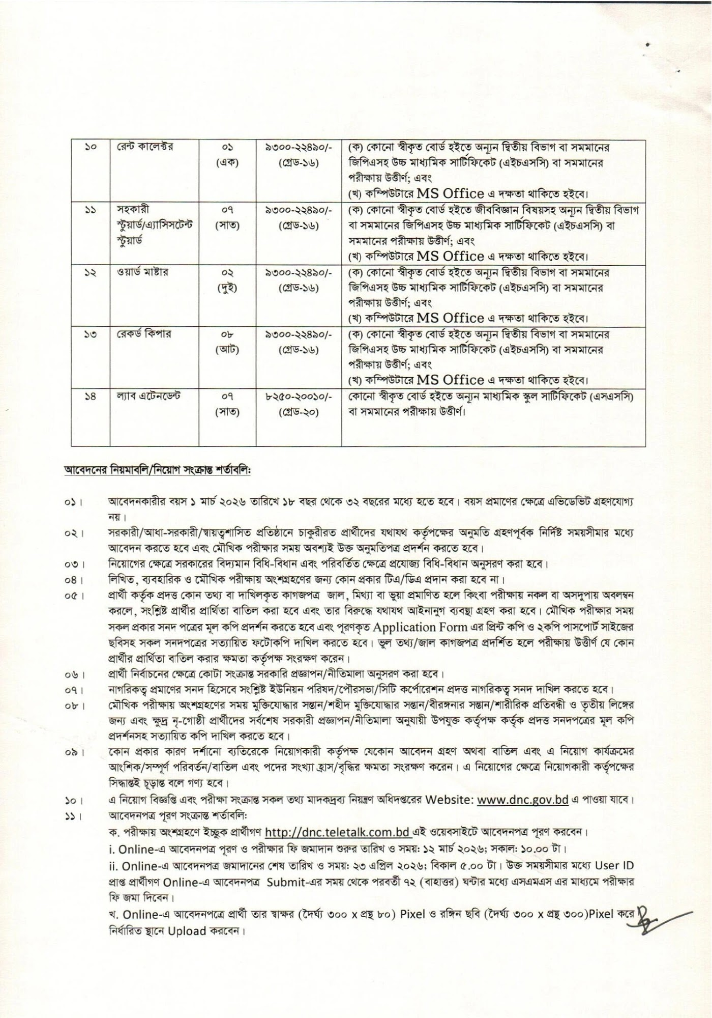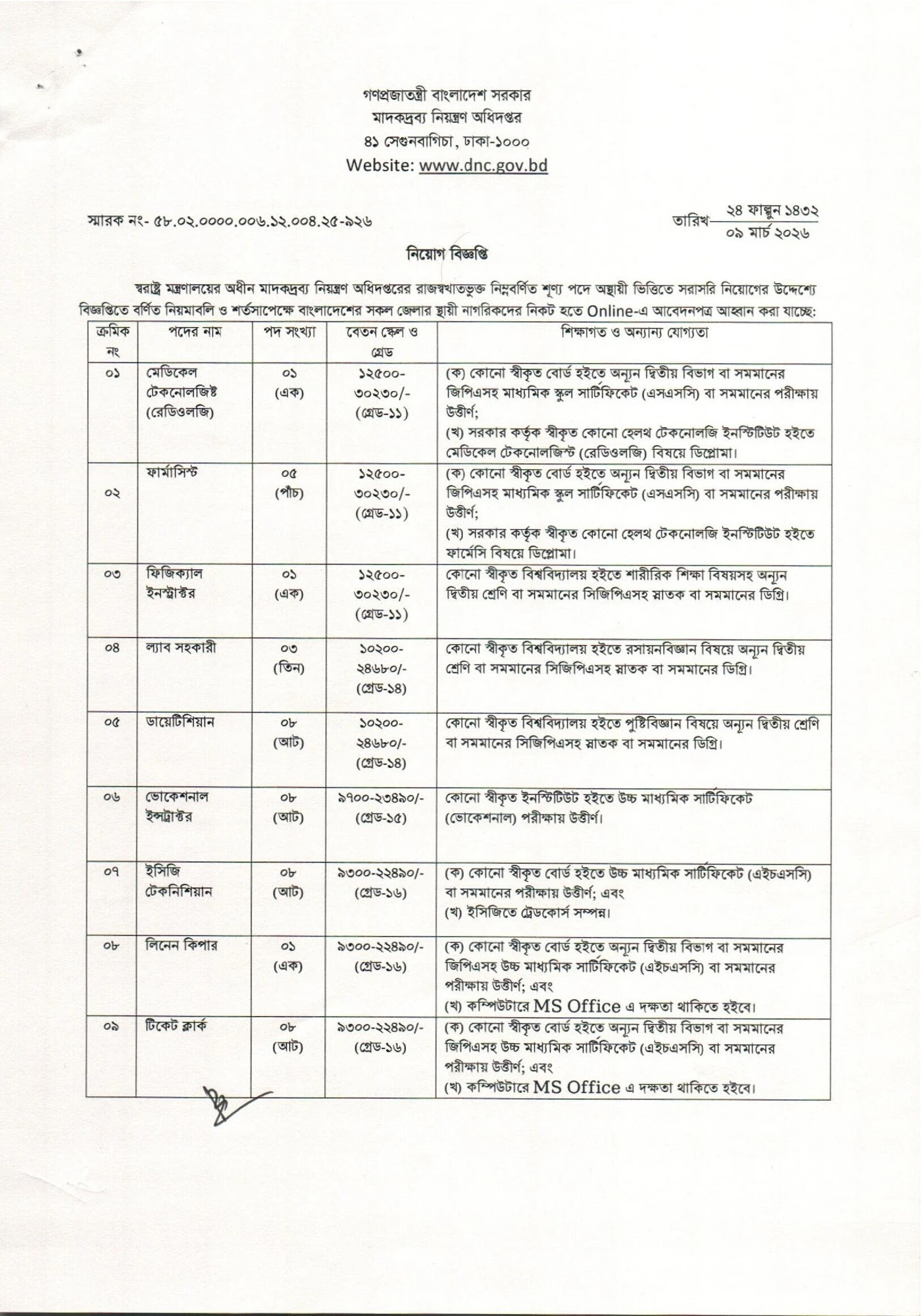 নিয়োগ বিজ্ঞপ্তির নাম: Department of Narcotics Control DNC Job Circular 2026