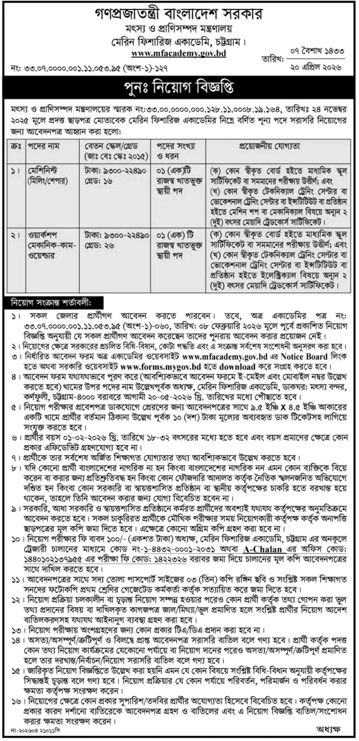 মেরিন ফিশারিজ একাডেমি চাকরির বিজ্ঞপ্তি 2026
