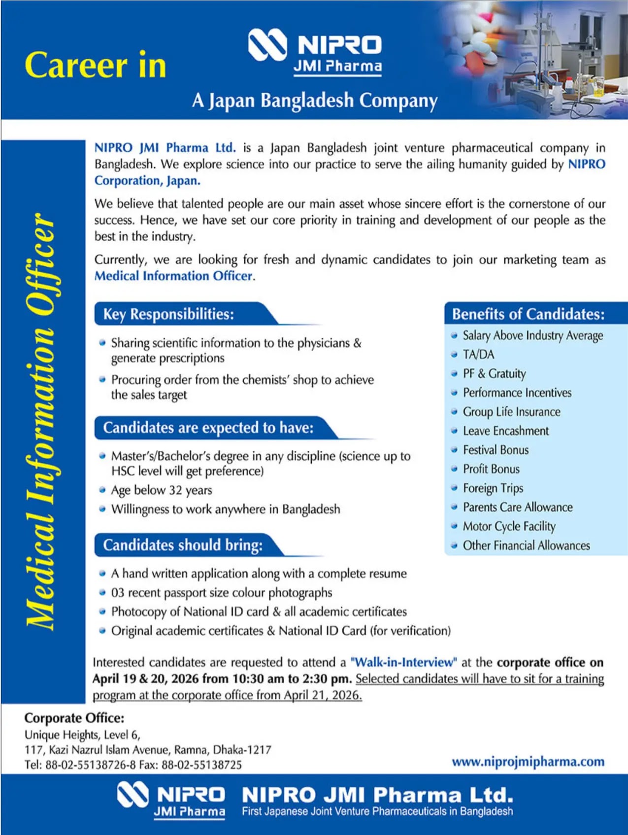 নিপ্রো জে এম আই ফার্মা লিমিটেড চাকরির বিজ্ঞপ্তিটিতে অধিকাংশ সময়ই সরাসরি সাক্ষাৎকারের মাধ্যমে নারী-পুরুষ উভয়কে চাকরির দিয়ে থাকে। তাই এবারও তার ব্যতিক্রম নয় সরাসরি সাক্ষাৎকারের মাধ্যমে নারী-পুরুষ উভয়কে চাকরি দেওয়ার ইচ্ছা পোষণ করেছে নিপ্রো জেএমআইফার্মা লিমিটেড।