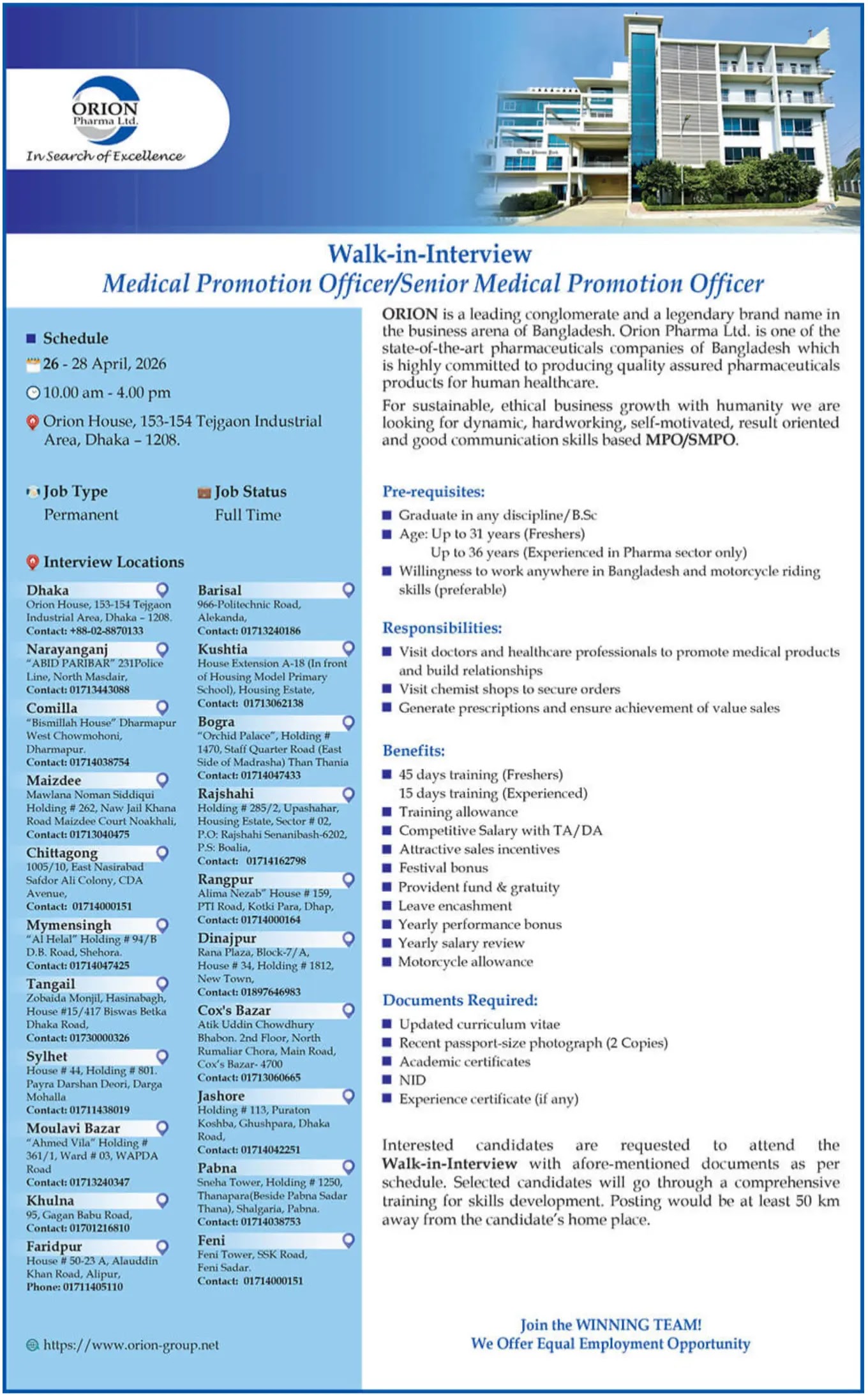 ওরিয়ন ফার্মা লিমিটেড প্রায় সময়ই সরাসরি সাক্ষাতে মাধ্যমে নারী-পুরুষকে চাকরি দিয়ে থাক। এ চাকরি বিজ্ঞপ্তিটিতে ও সরাসরি চাকরি দেওয়ার ইচ্ছা পোষণ করেছে ওরিয়ন ফার্মা।