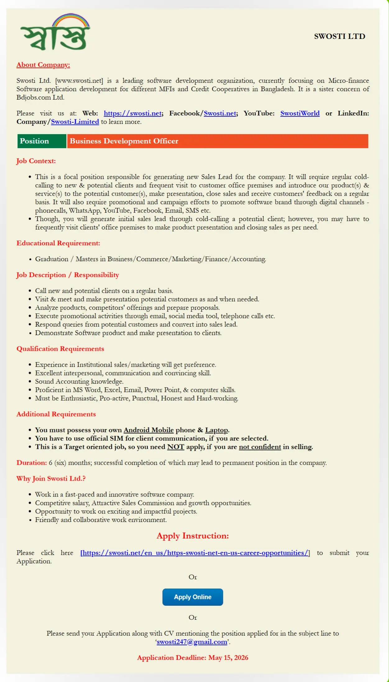 স্বস্তি লিমিটেড চাকরির বিজ্ঞপ্তি ২০২৬